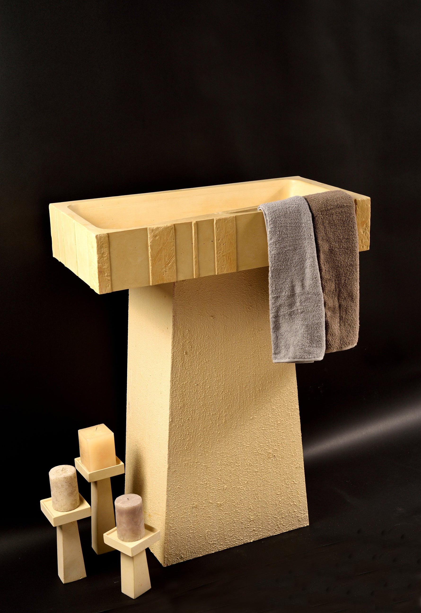 Unit price perSeize the opportunity to install a mere work of architectural art in your washroom, bathroom or restroom. People privy to the finer things in life commend this handmade concrete sink’s ability to procure an ancient desert chic Egypt aesthetic fit for royalty. Handcrafted from solid cement in a neutral flaxen shade of smoked saffron, the yellow sink looks as though it’s sculpted from earthen clay. But it's the details that establish this artisanal creation as an instant classic. The asymmetrical basin, optional outer wall texturing and built-in towel holder concertedly make an impact to usher in a whole entire experience.
